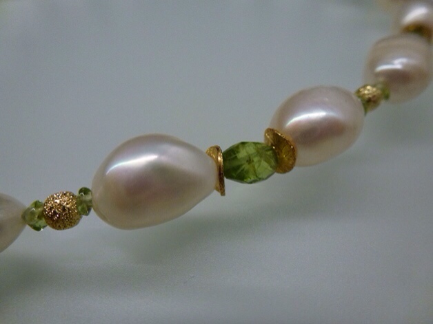 Collier – Zuchtperlen, geschliffener Peridot und vergoldete Zwischenteile Klassisch, elegantes Collier in weiß-grün-gold. Wunderschöne Zuchtperlen wechseln sich mit geschliffenem Peridot und vergoldeten Zwischenteilen ab.…