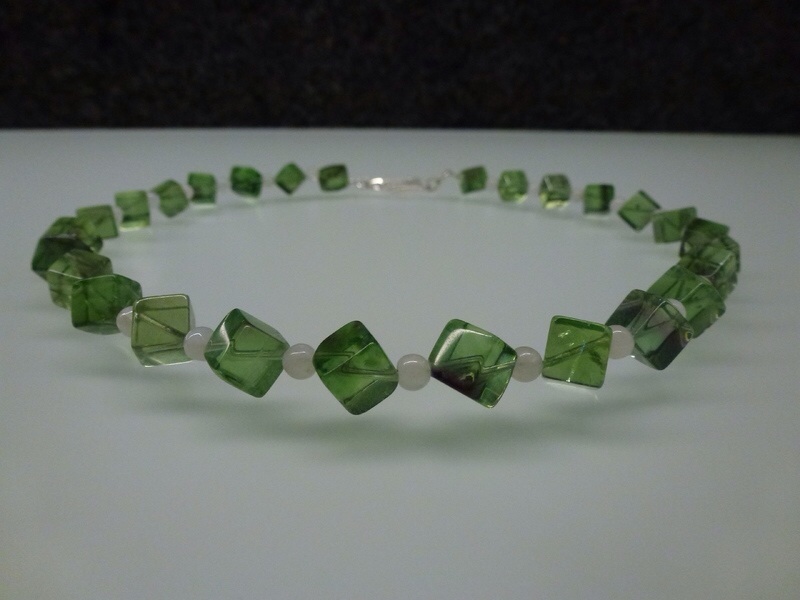 Collier – Tsavorit-Würfel und Girasol-Perlen. Erfrischend grünes Collier aus Tsavorit-Würfel, dazwischen feine Girasol-Perlen auf Edelstahlseil. Verschluss: Silber 925 Preis: 78.00€…
