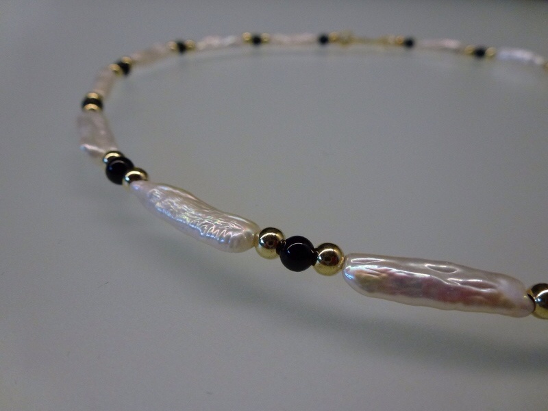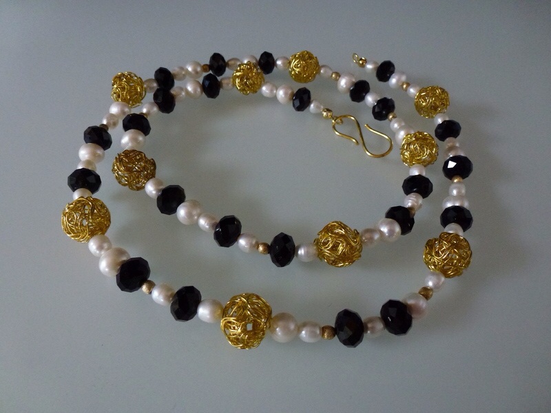 Collier – Zuchtperlen, Onyx und vergoldete Kugeln Eine Kette die sich anpasst, mal sportlich, mal elegant. Zuchtperlen, vergoldete Kugeln und glänzend geschliffene Onyxkugeln…