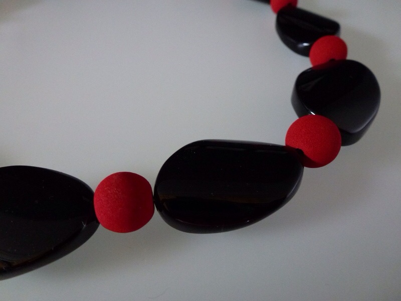 Collier – Onyxplatten und rote Lavakugeln Auffallendes Collier aus großen glänzenden Onyxplatten und feinen italienischen roten Lavakugeln. Die Kette wurde auf ein…