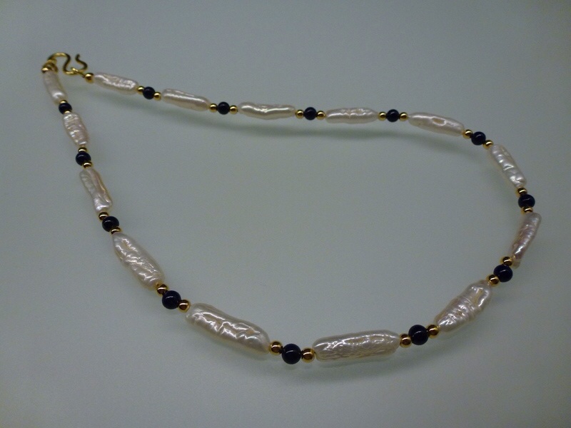 Collier – Zuchtperlen, Goldkugeln und Lapislazuli Sportlich-elegantes Collier in weiß-blau-gold. Zuchtperlen wechseln sich mit Goldperlen und Lapislazuliperlen ab. Preis: 75.00€…