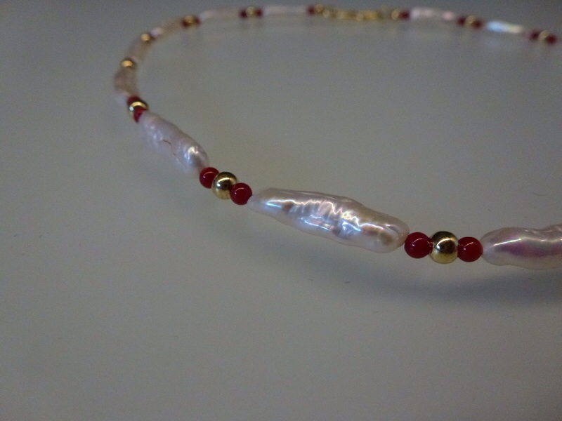 Collier – Zuchtperlen, Korallenkugeln und Goldkugeln Fröhlich und lebhaft scheint diese Kette durch die Farbkompination weiß, rot, gold. Glänzend geschliffene Korallenkügelchen wechseln…