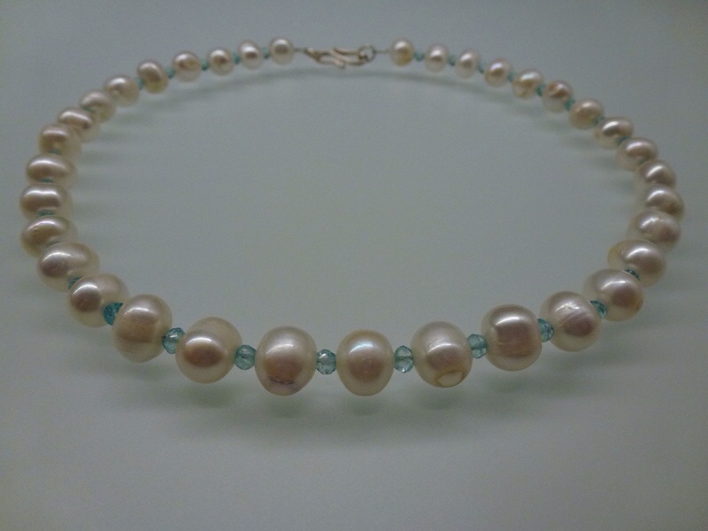 Collier – Zuchtperlen und geschliffene Quarzsteine Collier aus Zuchtperlen im Wechsel mit hellblauen geschliffenen Quarzsteinchen. Preis: 65.00€…