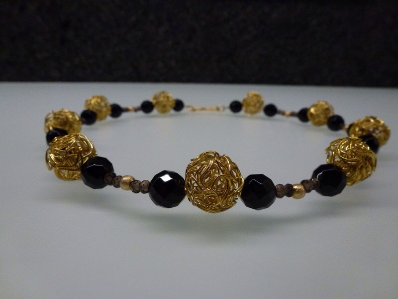 Collier – Onyxperlen, Rauchquarzperlen und vergoldete Zwischenteile Elegantes Collier in schwarz,gold. Geschliffene Onyx- und Rauchquarzperlen. Verschluss und Zwischenteile sind vergoldet. Preis: 75.00€…