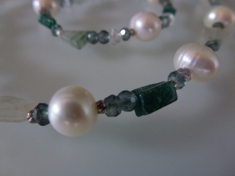 Collier – Zuchtperlen, Avanturine, Quarzsteine, Bergkristalle und Silberkugeln Erfrischende Kette mit Zuchtperlen, Aventurine und Quarzsteinchen im Facettenschliff,Bergkristallsteinchen und Silberkügelchen. Die Kette kann auch 4-fach…