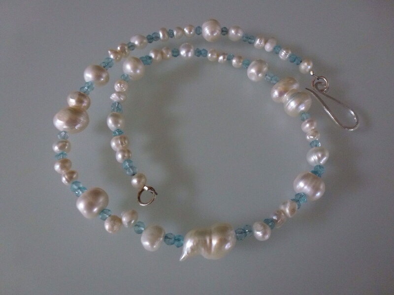 Collier – Zuchtperlen und Quarzsteine Eisblau erfrischend scheint diese eigenwillige Kette aus verschiedenen Formen von Zuchtperlen und hellblauen Quarzsteinchen. Verschluß aus…